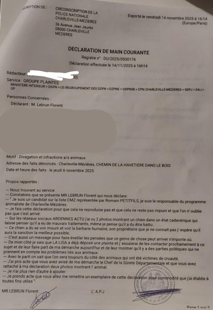 La découverte récente d’un chien retrouvé dans un état cadavérique d’une extrême gravité, à Charleville-Mézières, choque et révolte à juste titre. Face à cet acte de cruauté inqualifiable, il était indispensable que notre équipe prenne ses responsabilités.